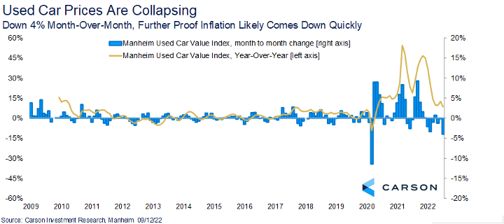 One of the main reasons we are optimistic that inflation could be about to come down quickly is used car prices are rapidly dropping. The recent Manheim Used Car Value Index fell 4% last month, which is one of the largest drops ever. Used cars make up a large part of inflation readings and this should provide a nice tailwind going forward.