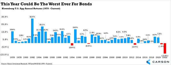 The Bloomberg U.S. Aggregate Bond Index is currently down nearly 14% for the year, far and away the worst year historically (since 1976). To put things in perspective, it had never been down two years in a row (which will likely happen this year) and the previous worst year was a 2.9% drop in 1994.