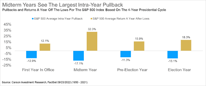 Stocks historically haven’t done very well the first few quarters of a midterm year, but they do quite well once the midterm election is over. In fact, since World War II, the S&P 500 has been higher a year after the midterm election every single time, up 14.1% on average. Much better times could be coming and soon.