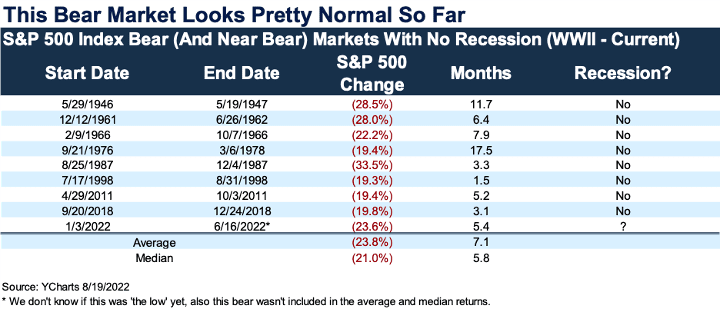 We continue to think the economy isn’t in a recession (more on this below), so that likely means stocks won’t fall significantly from here. Historically, the bear markets that took place without a recession showed stocks falling about 24% on average. In fact, only once did stocks fall more than 30% without a recession and that was the 1987 crash. More near-term pain is always possible, but a major low could be quite near.