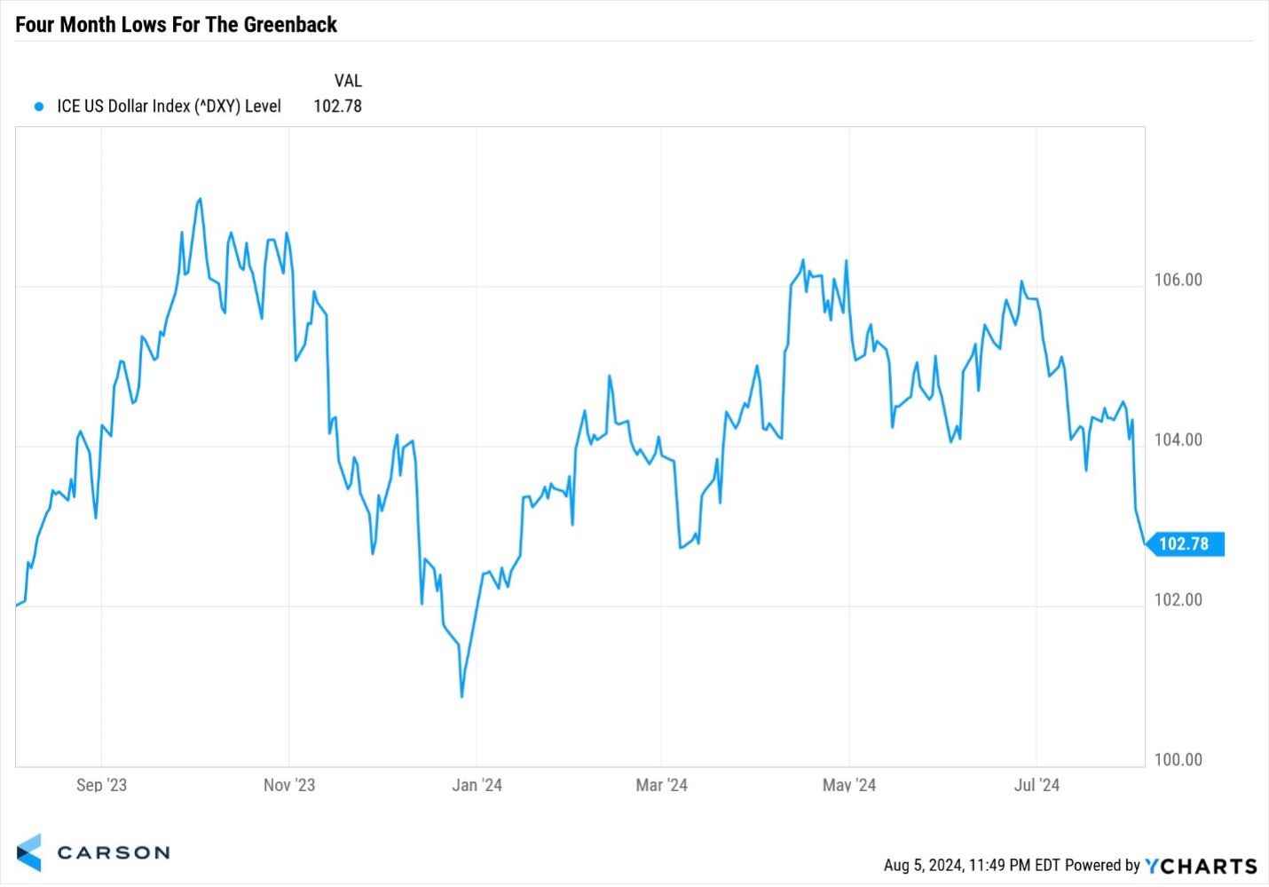 The third reason for the massive volatility is fears over the US economy slowing, potentially into a recession. At this time we don’t expect a recession, as this is more likely a growth scare, which aren’t uncommon, but it has many worried. Last week we saw disappointing manufacturing data and some high-profile earnings misses, and then Friday saw the monthly nonfarm payroll come in low at 114,000 jobs in July, versus a consensus expectation of 175,000, while the unemployment rate ticked up to 4.3%. Those aren’t horrible numbers, but they do suggest slowing economic growth.