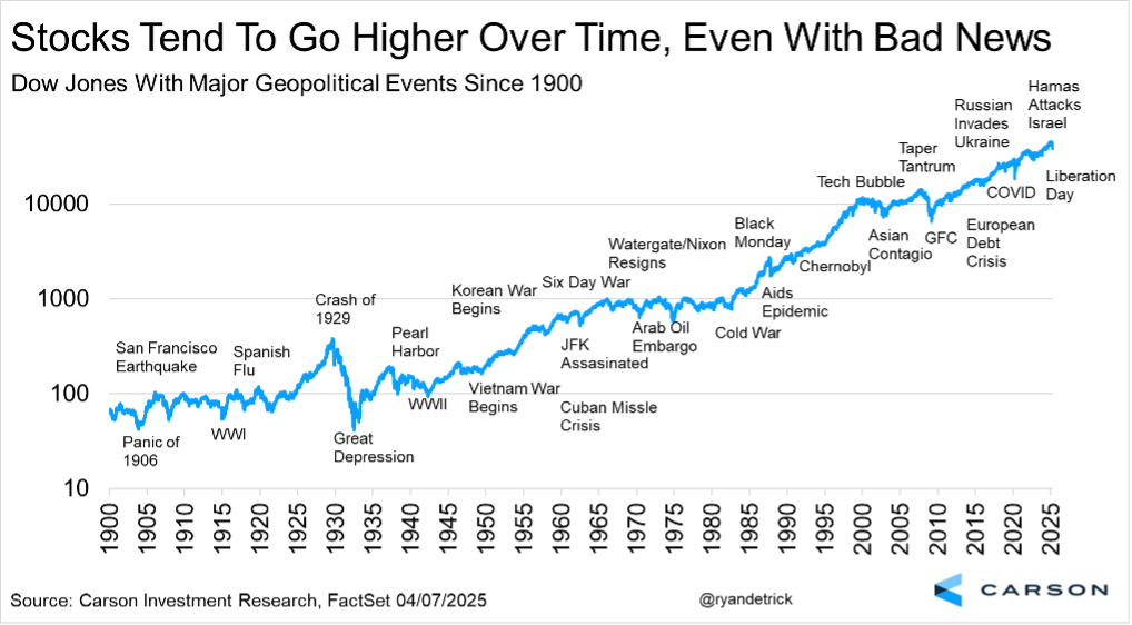 A lot of bad things have happened since 1900, yet the Dow has continued to move back to new highs after every single one of them. The truth is a lot of good things have happened throughout history, too, but we usually don’t hear as much about those. As bad as the reaction has been to “Liberation Day,” we don’t think this will be any different than the other bouts of bad news, as some day in the future new highs will very likely happen.