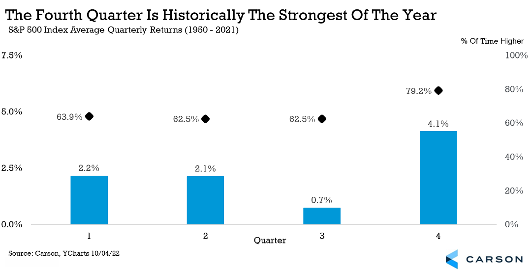 First, the fourth quarter is historically the best quarter of the year, with the S&P 500 up 4.1% on average and up nearly 80% of the time.