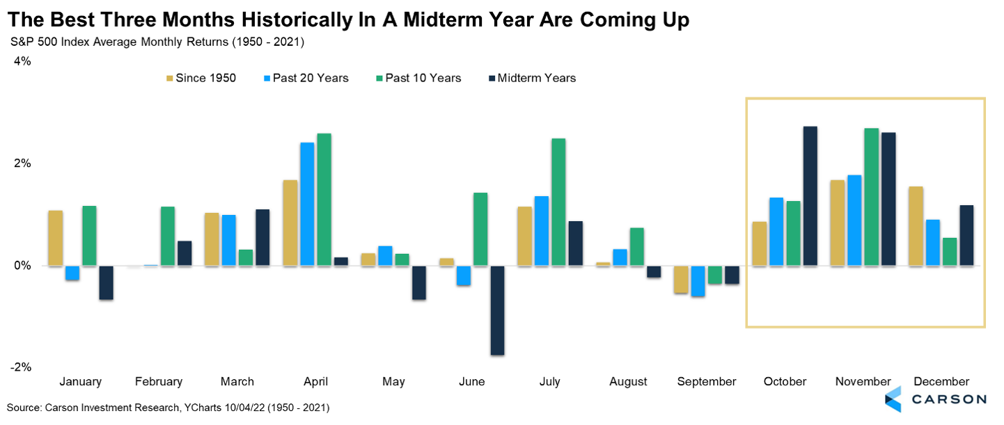 Second, this is a midterm year. The good news is that market gains during these years are backloaded. In fact, October is typically the best month of a midterm year, followed up by the second-best month in November and third best in December.