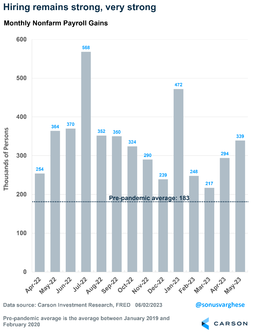Two months of payroll data have been reported since the Silicon Valley Bank crisis in March, and nothing suggests weakness arising from the banking crisis.