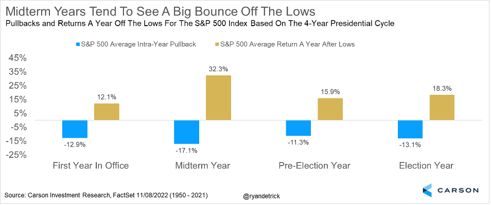 Should we be surprised that stocks have had a tough go so far in 2022? Maybe not, as this next chart shows the worst time for stocks is a midterm year under a new President. With the S&P 500 up only 2.4% on average these years, it helps put the disappointing year so far into perspective. Now check out what happens the following year, which might be something many investors could be smiling about soon enough.