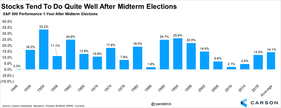 What is clear cut is stocks historically have done quite well the year after the midterms. As you can see in our last chart, the S&P 500 gained a year after the election every single time since World War II, with a very solid 14.1% average gain over that year. Why is this? Likely markets hate uncertainty and there is a lot of that leading up to a midterm election. But once the election is over the uncertainty is likely lifted.