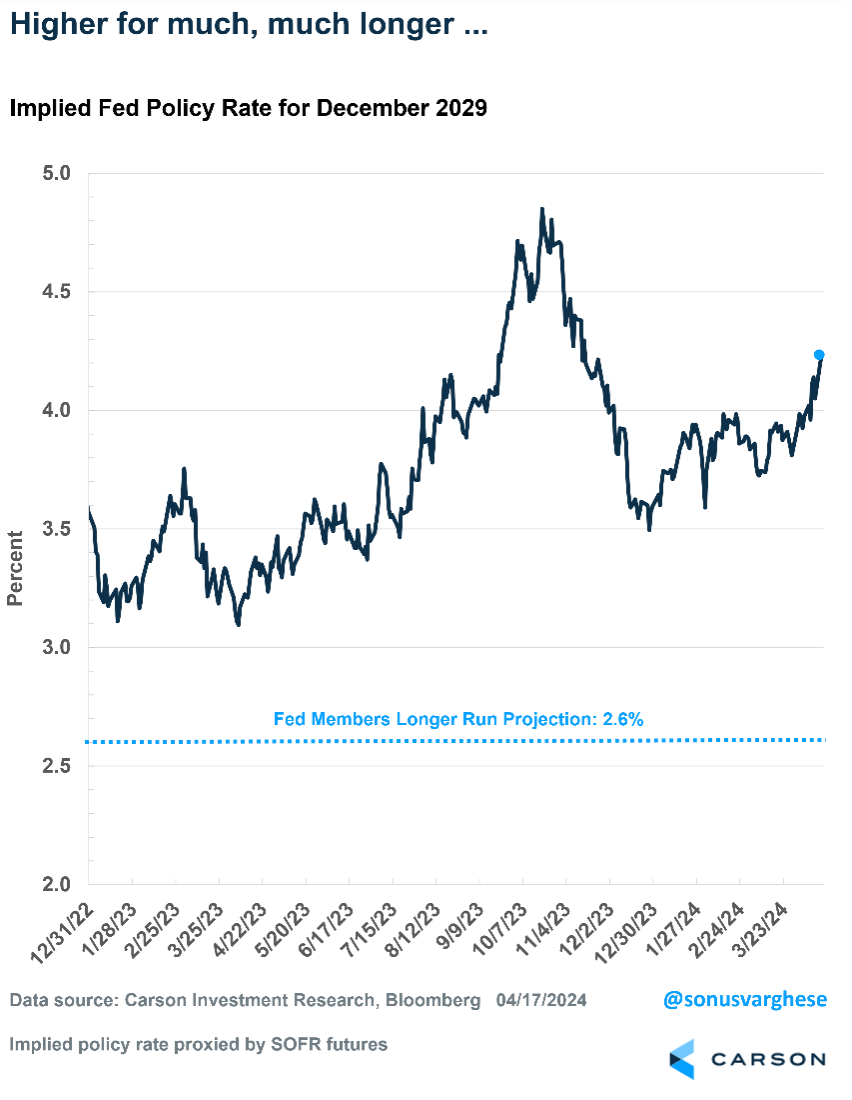 At first approximation, long-term rates are simply an estimate of future short-term Fed policy rates. Higher long-term rates means investors now expect higher policy rates in the future. In fact, expected policy rates for 2029 are now higher than 4%, well above where they were at the end of 2023. That implies investors expect stronger economic growth in the future, with robust labor markets and high productivity. At the same time, an economy running near capacity means potentially more inflationary pressure, which is why investors expect policy rates to stay on the higher side.