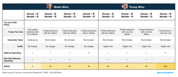 On the other hand, Biden has said he will not renew all the individual tax cuts, so cuts for the highest tax brackets would go away. He has also raised the possibility of raising corporate taxes. Of course, he will need a Democratic sweep of the House and Senate for this to happen, and that is looking very unlikely. The table below shows scenarios for control of Congress under Biden or Trump and the likely impact on the fiscal deficit.
