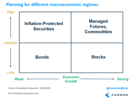 The chart above shows how we view allocating among asset classes depending on the macroeconomic regime. Right now, we believe the positive outlook for profit growth amid a strong economy makes the case for overweighting equities and underweighting bonds — amid a high economic growth environment. At the same time, a high-capacity economy that is likely to see inflationary pressures from time to time makes the case for diversifying away from bonds and into asset classes such as managed futures. Managed futures is a trend-following strategy that can take long or short positions in commodities, interest rates, equities, and currencies and provide valuable diversification to stocks and bonds. Periods of rising inflation, and rising rate expectations, can put pressure on both stocks and bonds, increasing the importance of diversification outside these two traditional asset classes.