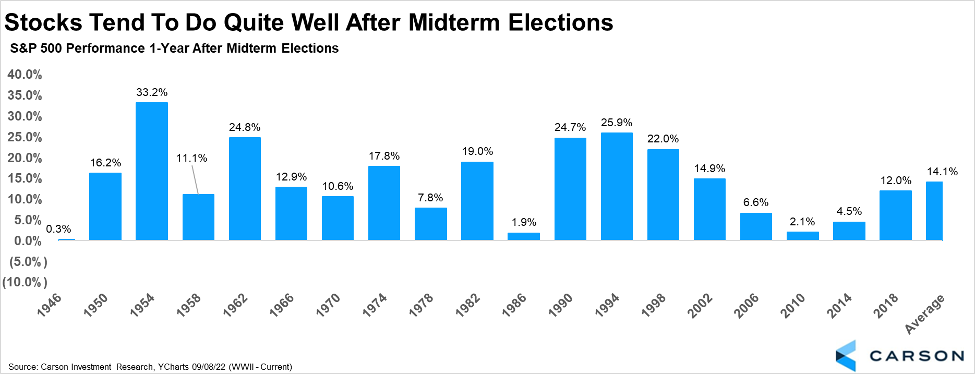 • Stocks have been higher a year after midterm elections ever since World War II.