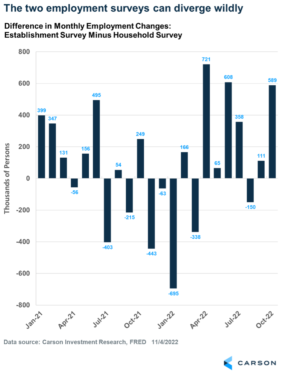 In the October report, the unemployment rate rose because the household survey showed the number of unemployed persons rose. The survey also showed the number of employed workers fell by 328,000, which is completely opposite of what the establishment report showed (+261,000). That’s a massive difference of almost 600,000. But this is not unusual, as the chart below illustrates.
