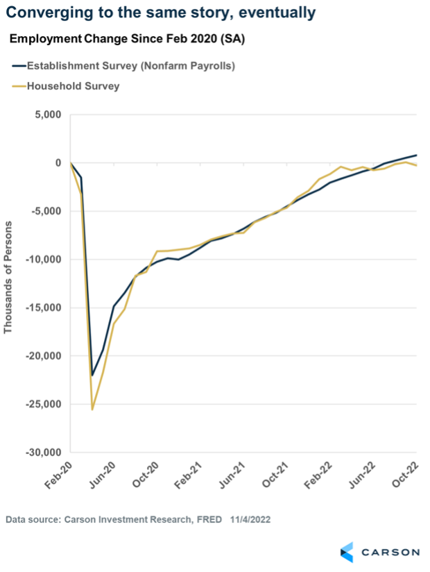 Over short periods of time, one survey can accelerate much faster than the other. During the height of the pandemic (Mar-Apr 2020), the household survey reported significantly more job losses than the establishment survey: 25.5 million vs. 22 million. But the household survey caught up and even ran ahead of the establishment survey through January of this year. Now the establishment data is powering ahead while the other slows.