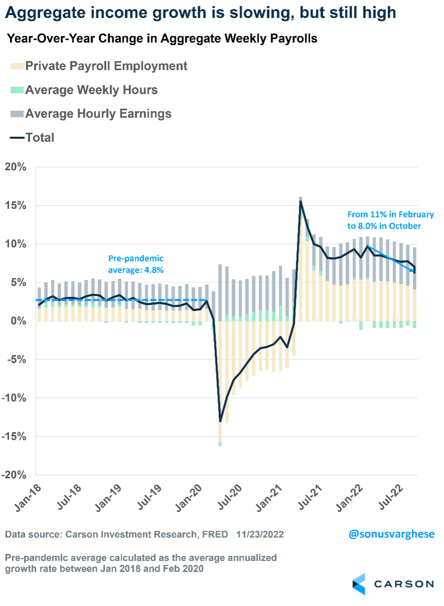 Aggregate earnings growth has slowed this year, from 11% to 8%. However, it is still higher than the pre-crisis pace of just under 5%. Employment growth will likely slow in 2023. Payroll gains have averaged about 289,000 over the past three months, but even half that number would create solid income growth comparable to pre-pandemic levels.
