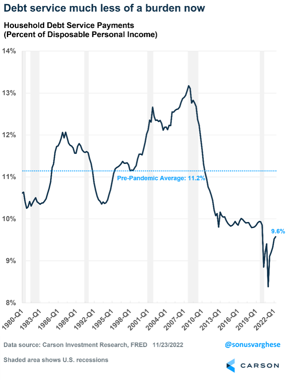 Credit card spending is rising, which is not surprising. Prices are higher and consumers are spending more (even adjusted for prices). But more important than total debt is the debt service burden for households, which is close to record lows. The chart below shows households’ debt service as a percent of disposable income. As of the end of the second quarter, this metric was at 9.6%, well below the pre-pandemic average of 11.2%.