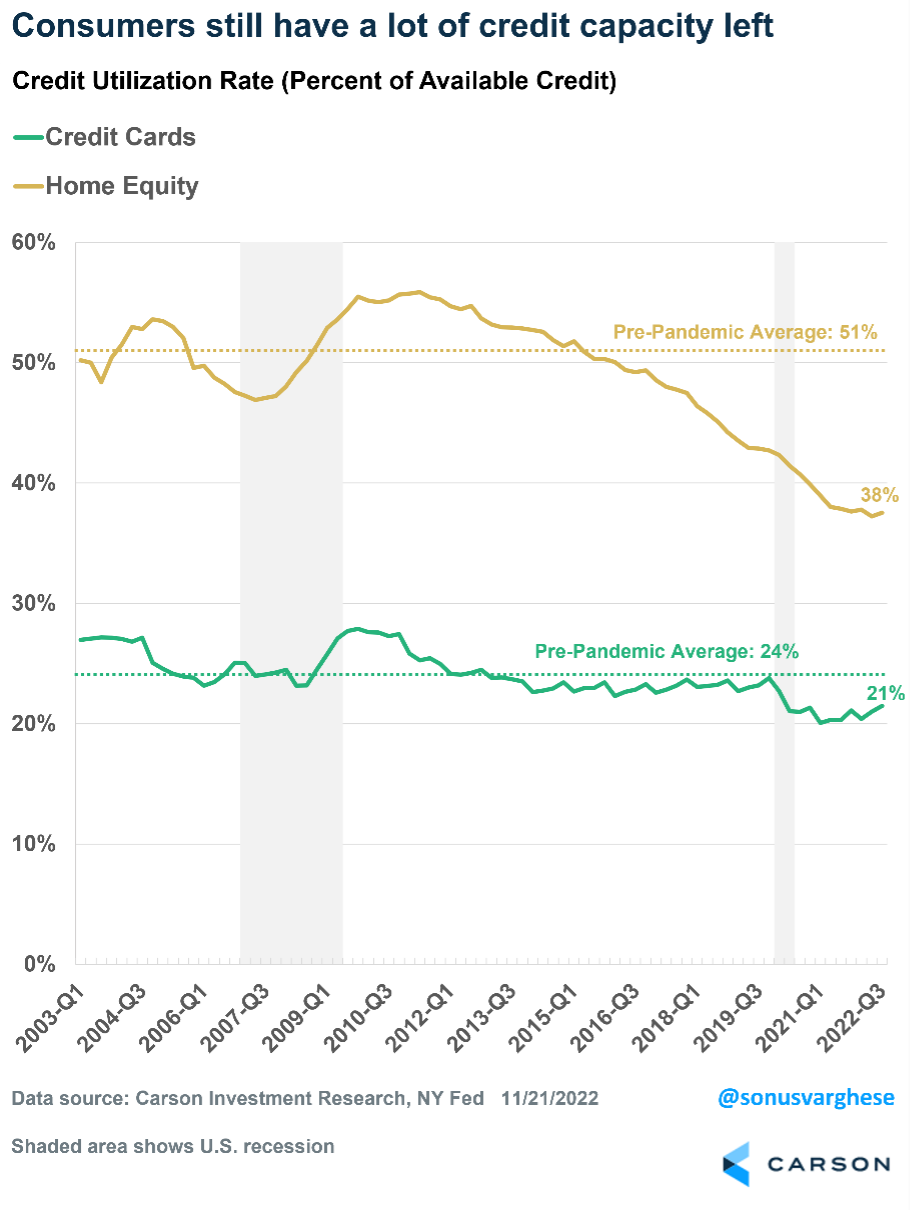 Also, credit utilization rates are still low. Consumers have yet to tap into their credit cards and home equity lines of credit to the same extent as before the pandemic hit. Utilization rates are also well below average levels over the past few decades.
