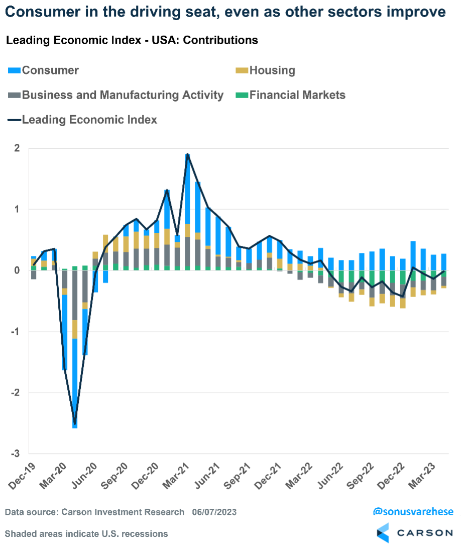 The following chart captures a close-up view of the last three and a half years, which includes the COVID-19 pullback and subsequent recovery. The contribution from the four major categories is also shown. It is clear how the consumer has remained strong over the past year. In fact, consumer indicators have been stronger this year than in late 2022.