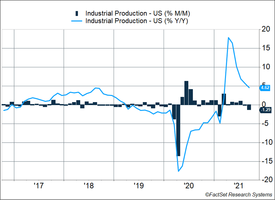- U.S. industrial production slid 1.3% last month as the shortage of semiconductors pushed auto production down 7.2%.