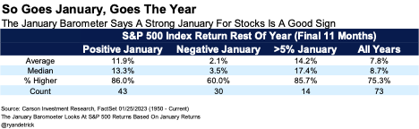 With only two days to go, the stock market is off to one of its best January starts, with the S&P 500 up close to 6%. This is a great sign for the bulls, as the so-called January Barometer is typically a good indicator for the year. When stocks are green in January, the next 11 months are up close to 12% on average, and the market is higher 86% of the time. When January is down, such as it was in 2022, those averages drop to 2.1% and 60%, respectively.