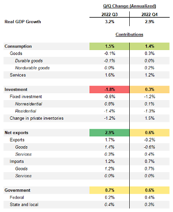 The latest GDP growth numbers for the fourth quarter of 2022 came in at 2.9% quarter-over-quarter (annualized rate), which was higher than expectations for a 2.6% reading. This is only slightly below the third quarter growth rate of 3.2%. The first two quarters of last year saw negative growth, so this is a nice bounce back.