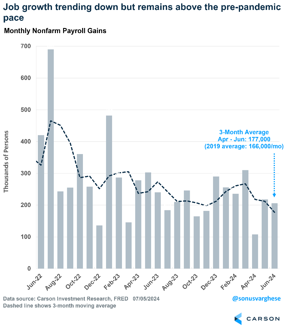 - The economy added 206,000 jobs in June, ahead of expectations of 190,000.