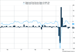 - Retail sales have declined for three consecutive months (dark blue bars). During the strong employment environment prior to COVID-19, there were only incidental declines.