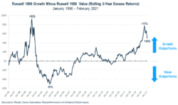 November 6, 2020, was the Friday before the first successful vaccine trial was announced. The high level of protection offered by the vaccine caused investors to anticipate a broad reopening, and value stocks rallied more than growth stocks. In Figure 1, this rally is shown by the line trending lower. The last time growth outperformed value by this wide a margin, it peaked at 92% and then plummeted as the technology bubble popped and growth stocks sank.