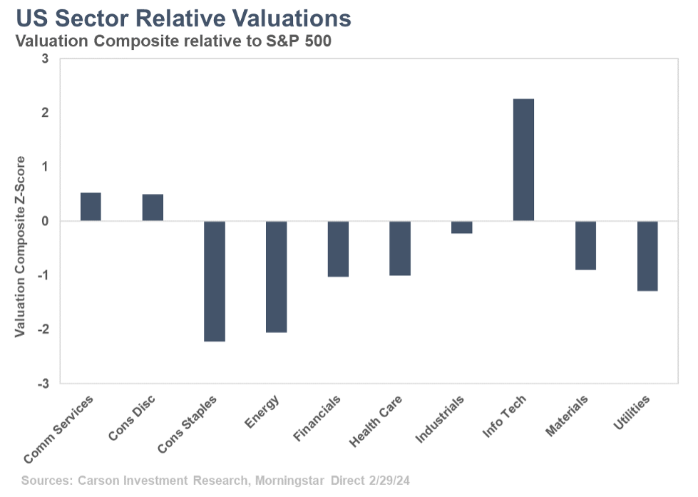 A composite of valuation metrics relative to the S&P 500 index shows technology and technology-related sectors have higher valuations relative to their history. Information technology is nearly two standard deviation points overvalued or higher than all but just over 2% of its history. Defensive and cyclical sectors are trading at discounts relative to the rest of the market and their own history.