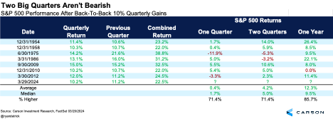 Following the huge 11.2% rally for the S&P 500 in the fourth quarter of 2023, the index provided an encore performance in the first quarter with a 10.2% gain. Big gains like this in Q1 aren’t common. The S&P 500 has gained more than 10% in the first quarter only 11 times in its history, and what followed was typically good for the bulls.