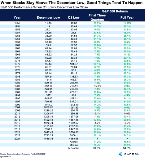 One of our favorite indicators at Carson Investment Research is the December Low Indicator, which is fairly straightforward. When the S&P 500 doesn’t close beneath the December low in the first quarter, the market has typically been positive the rest of the year. The opposite, of course, is when the December lows are violated in the first quarter. Last year, the S&P 500 didn’t break the December low, and it was a great year. However, a break in early 2022 indicated elevated odds that the rest of the year could be dicey. Given that stocks didn’t break their December low this year, this signal is less worrisome.