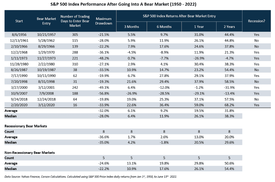 Markets often rally after entering bear markets because investors reach a point of high pessimism. During declines, it is easy to identify the challenges market face. The case for why things will improve is often more nuanced and less vivid. Yet, based on historical performance, the most realistic assumption is the market will recover eventually and patience is often the most important investor virtue. Anything you can do to stretch out your time horizon can help make investing less challenging and more rewarding. Please let us know if there is anything we can do to help you.