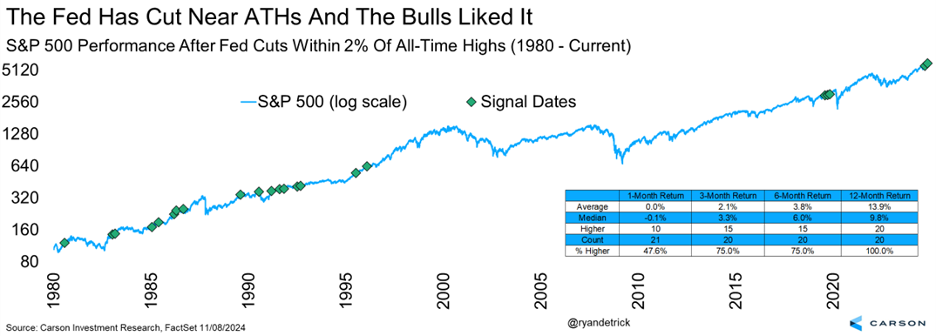 Earlier this month the Fed cut interest rates with the S&P 500 near all-time highs. Here’s a chart we’ve shared many times before, but it is just as relevant now as it was then. We found 20 other times (back to 1980) that the Fed cut with the S&P 500 within two percent of an all-time high and stocks were higher a year later all 20 times and up an average of nearly 14%. As much as the Fed was a headwind in 2022 when they aggressively hiked to slow inflation, it has been a tailwind since July 2023 when they stopped hiking. Now, as this easing cycle continues, the tailwind remains strong, another reason to be thankful.