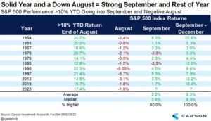 Examining previous years that were lower in August but up more than 10% heading into September shows that stocks closed higher eight out of 10 times. Importantly, the rest of the year was higher every time.
