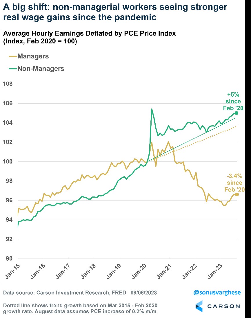A large part of the economy’s resilience has to do with a strong labor market that has surprised many economists and market-watchers. While employment is certainly slowing from its torrid pace earlier this year, that is likely normalization. Real incomes are rising once again as inflation recedes. But here’s a point not widely talked about: Income growth, especially after adjusting for prices, has been much stronger for “production and non-supervisory” workers, i.e., non-managers, than for managers.