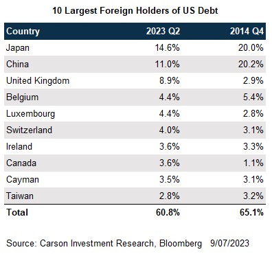 Foreign holdings of U.S. debt have fallen to less than a quarter of the total. Japan remains the largest holder of U.S. debt. China’s share has fallen. At the end of 2014, China held about a fifth of the foreign share. That’s fallen to 11% as of the second quarter of 2023. It’s also likely China spreads out the source of its purchases of U.S. Treasuries globally, notably using a Belgian custodian for a portion of its holdings — there’s a reason tiny Belgium is the fourth-largest foreign holder of U.S. debt.