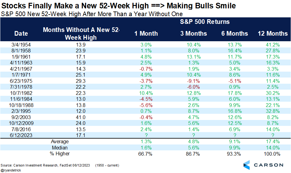 The S&P 500 finally made a new 52-week high last week after going 17 months without one. While it’s still about 8% from new all-time highs, a new 52-week high strongly indicates this bull market has lasting power. In fact, we found that when stocks went more than a year without a new 52-week high and finally made one, future returns were quite strong — up 15 out of 15 times and by 17.4% on average.