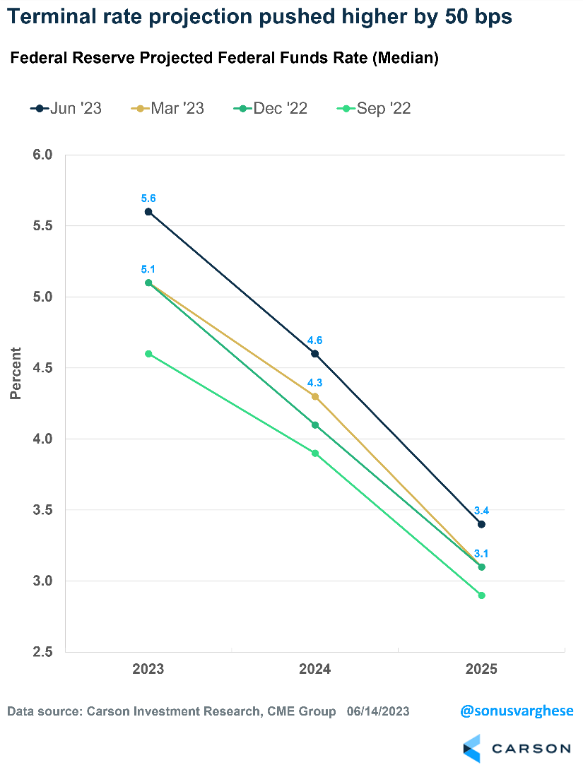 Fast forward three months: The economy has weathered the banking crisis, even as core inflation (excluding food and energy) remains elevated, and the Fed believes rates should end the year higher.