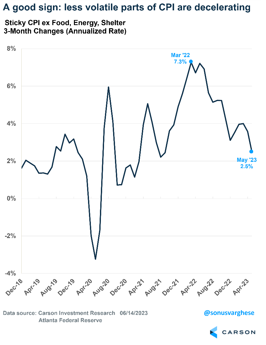 Fed members have said they need to see services inflation excluding shelter decelerate. We received good news on that front. The Atlanta Federal Reserve calculates something called the Sticky Price CPI, which excludes food, energy, and shelter. It measures inflation for items whose prices typically don’t change frequently. Over the past three months, this measure has run at a 2.5% annualized pace, well below last year’s peak of 7.3%.