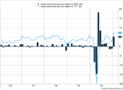 Regarding where the money has been spent, the theme of creating a cozier home environment continued, as the two largest increases were in electronics and appliance stores (14.7%) and in furniture and home furnishings (12%). And while building materials, garden equipment and supply stores (think home improvement) only saw an increase of 4.6% on the month, year-over-year it is up 19%. Another trend we observed was the continued increase in online sales, which rose another 11% for the month and is now up almost 29% since last year — a transformation in U.S. consumer behavior we expect will continue.