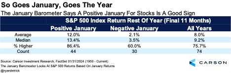 - S&P 500 gains in January have historically signaled above-average returns the rest of the year.