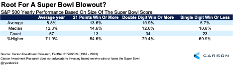 It might not matter which team wins but rather by how much they win. That’s right, the larger the size of the win, the better stocks do. (Let’s have another disclosure that nearly everything I’m saying here isn’t in any way, shape, or form related to what stocks actually do.) When the Super Bowl ends in a single-digit win, the S&P 500 is up less than 6% on average and is higher about 60% of the time. A double-digit win? The data jumps to about 11% and 79%. When the final score is three touchdowns or more, the S&P 500 gained 13.6% on average for the year and is higher about 85% of the time.