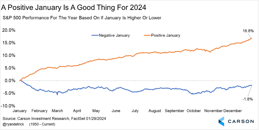 The huge end-of-year rally in 2023 (the S&P 500 was up 14% in November and December) did suggest some weakness in late December and early January would be normal. But the bottom line is the January gains matter more.