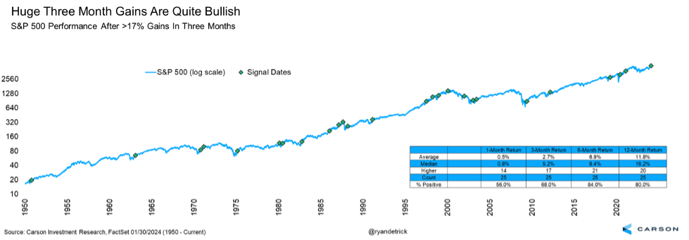 We are officially three calendar months off the October 27, 2023, correction lows. Stocks gained 19.6% during those three months, marking one of the best three-month returns ever. We reviewed all the times the index gained at least 17% in three months, and the future returns were quite normal for a bull market: higher six months later 84% of the time, higher a median of 16.2% one year later, and up 80% of the time.