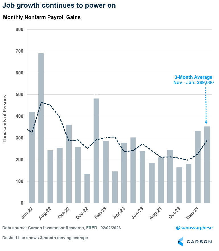 The January payroll report blew past expectations. The economy created a whopping 353,000 jobs in January. Even better, the net job gains in December were revised up from 216,000 to 333,000. So, the economy has averaged 289,000 jobs per month over the last three months. For perspective, the average in 2019 was 163,000. Additionally, job creation in 2023 was better than originally estimated — across the full year, the economy created just more than 3 million net new jobs, versus the prior estimate of 2.7 million.
