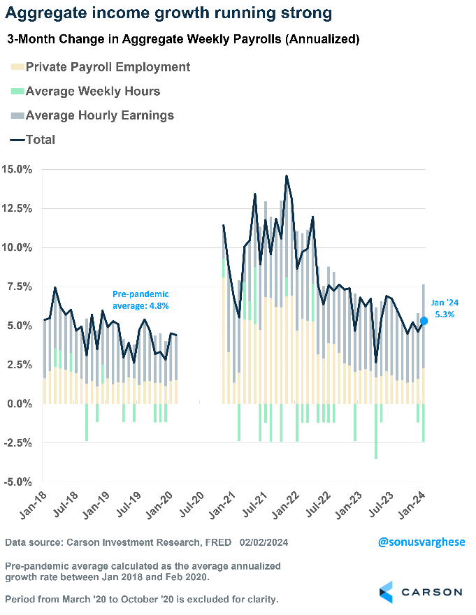 What matters for consumption is incomes, and over the last three months, income growth across all workers in the economy has been running at an annual rate of 5.3%. That is above the pre-pandemic pace of 4.8%, which was also strong. Aggregate income growth is the sum of: