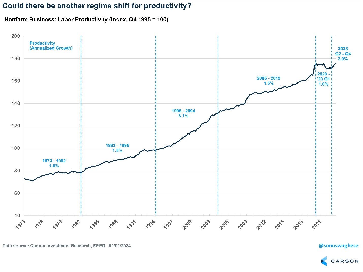 As noted in our 2024 Outlook, which you can download here, productivity growth is a potential game changer, if it continues. When productivity growth is strong, workers can see robust wage gains even as inflation remains muted. It allows the Federal Reserve to ease up on interest rates, which can spur business investment and further boost productivity. A key part of this is a strong labor market, as that’s ultimately what forces businesses to invest in productivity-boosting technologies. The Fed obviously plays a key role here, but we believe it will start cutting rates as early as May or June. That’s another tailwind for the economy.