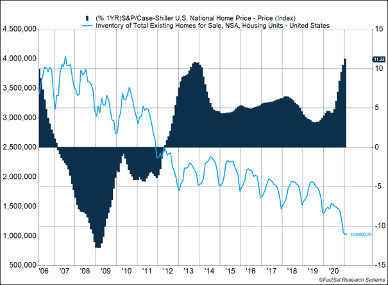 Last week the S&P CoreLogic Case-Shiller Home Price Index showed that home prices in major metropolitan areas have increased by 11.2% over the last 12 months (Figure 1), the highest increase since February 2006. The surge in prices was seen across the country, with some metro areas, such as Phoenix and Seattle, seeing price hikes of 15.8% and 14.3% respectively. The rate of increases over the past six months is even faster than during the subprime lending boom that led to the global financial crisis. This surge can be attributed to simple economics — demand has surged while supply has tumbled.