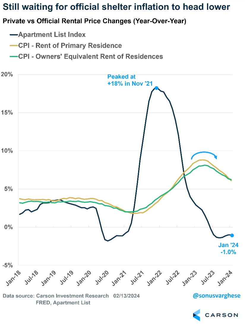 Apartment List’s national rental index has been decelerating since November 2021, and rents have been falling on a year-over-year basis for eight months. Official shelter inflation finally started decelerating last summer, but it’s been agonizingly slow.