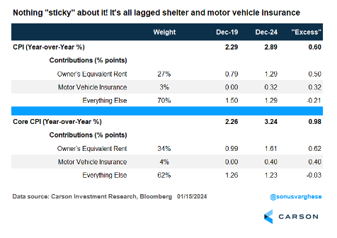 Let’s focus on where “excess inflation” is coming from for CPI and compare the 2024 data to 2019 (when headline and core CPI were up 2.3% year over year). There are two main drivers of excess inflation: shelter and motor vehicle insurance.