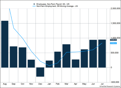 July nonfarm payrolls expanded 943,000, easily beating an average prediction of 875,000. The prior two months were revised a combined 119,000 higher. Adding the revisions to the preliminary July estimate means more than 1 million people were employed at the end of July than was estimated one month earlier.